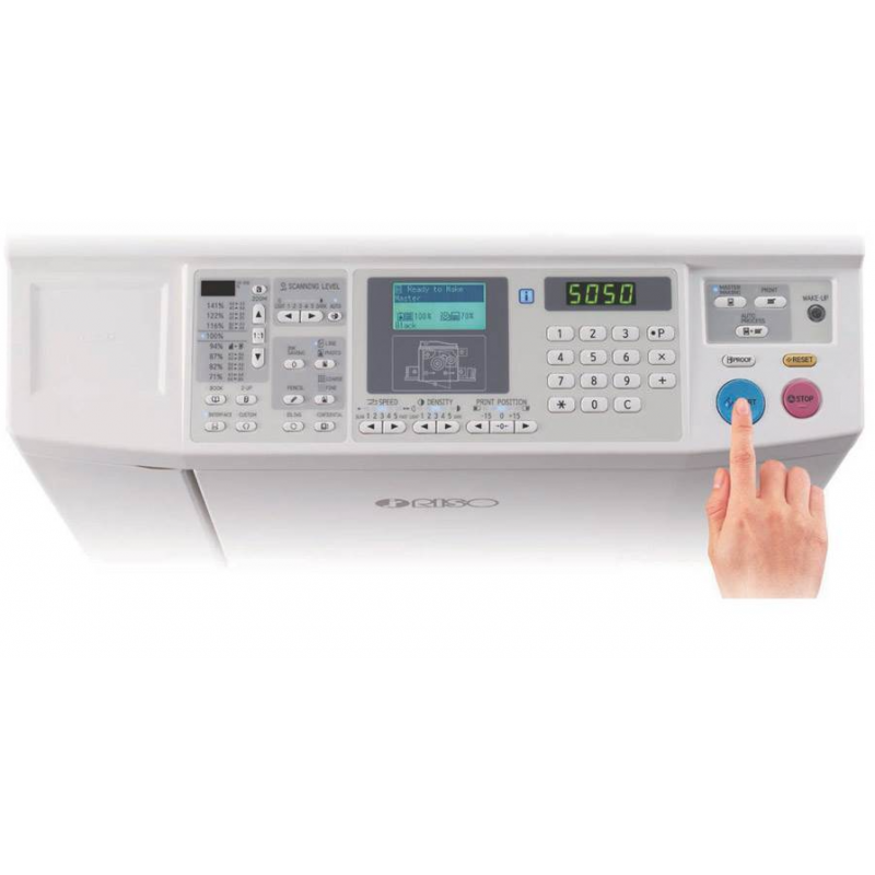 | Fonctions | Mode de numérisation de l’original, niveau de numérisation, agrandissement/réduction, traitement du point, impression deux poses, livre, économie d’encre, création rapide de masters, ADF semi-automatique (accessoire en option), vitesse, densité, position d’impression, programme (A/B), contrôle de l’alimentation, tri par feuille, séparation des tâches, ralenti, mode confidentiel, affichage compteur, rapport comptabilisant les tirages, épreuvage, reproduction directe, impression à partir d’une clé USB, impression papier en mémoire, mise en veille / mise hors tension automatiques, mode ECO, RISO iQuality System |